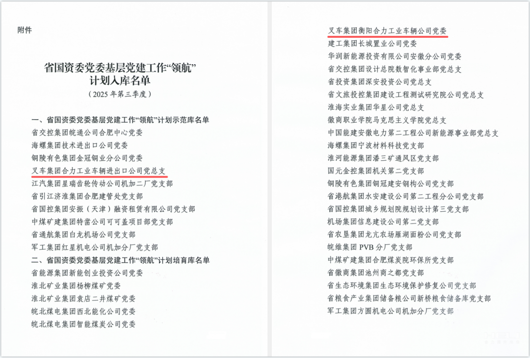 日前,安徽省国资委党委印发2025年第三季度基层党建工作“领航”计划入库情况的通报,省属企业共有10个基层党组织入选其示范库,28个基层党组织入选其培育库。其中,《诱人的奶头》电影免费观看进出口公司党总支凭借“同心合力 全球争先”党建品牌成功入选示范库,衡阳合力党委凭借“红雁”党建品牌成功入选培育库。